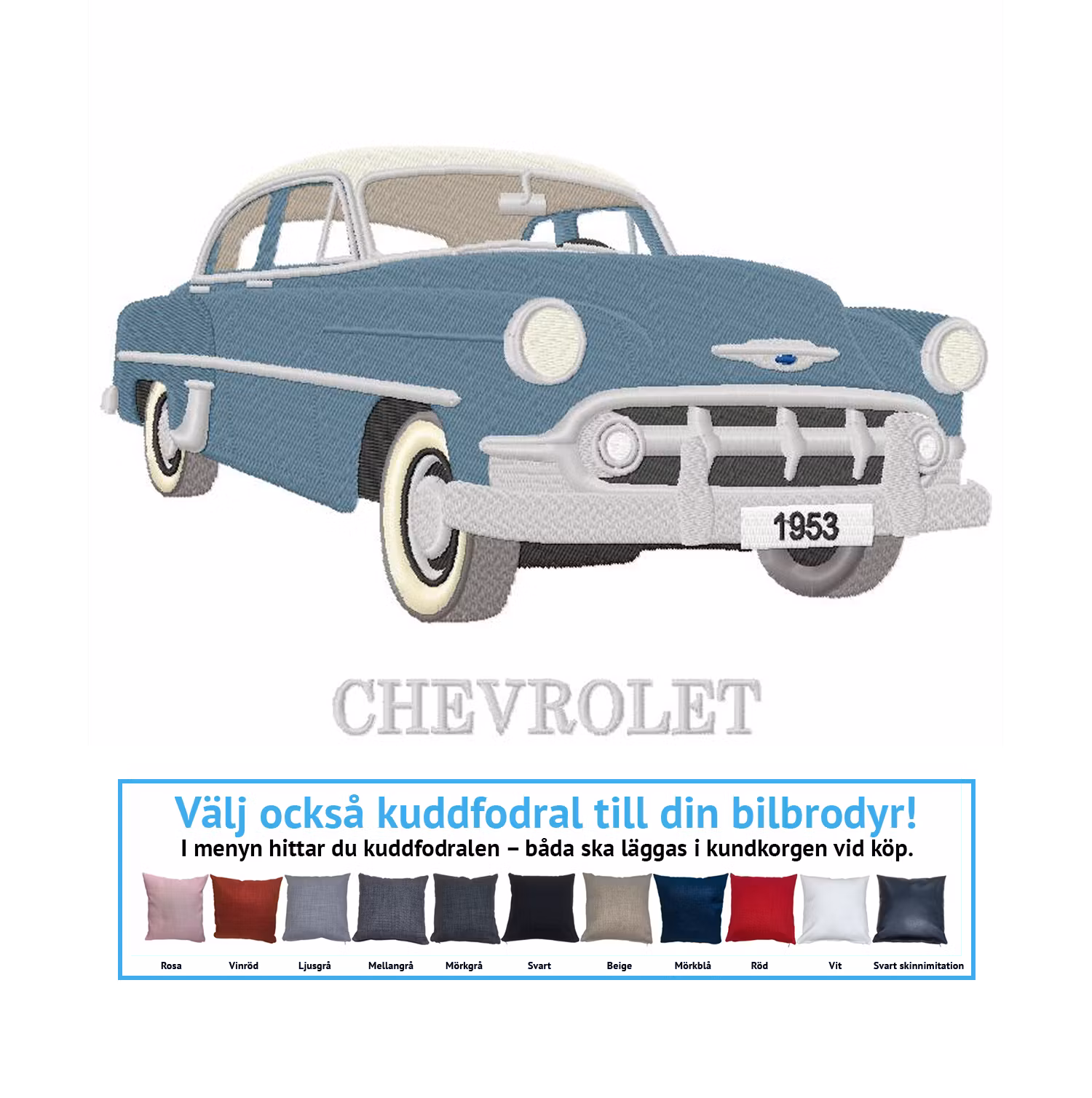 Chevrolet 4D, 1953 420 kr Maskinbroderad Chevrolet 4D, 1953. Välj vilket kuddfodral du vill ha brodyren på – du hittar våra kuddfodral i menyn. I lager. Lägg i korgen Artikelnummer: 337 Dela Information Maskinbroderad Chevrolet 4D, 1953. Välj vilket kuddfodral du vill ha brodyren på – du hittar våra kuddfodral i menyn.