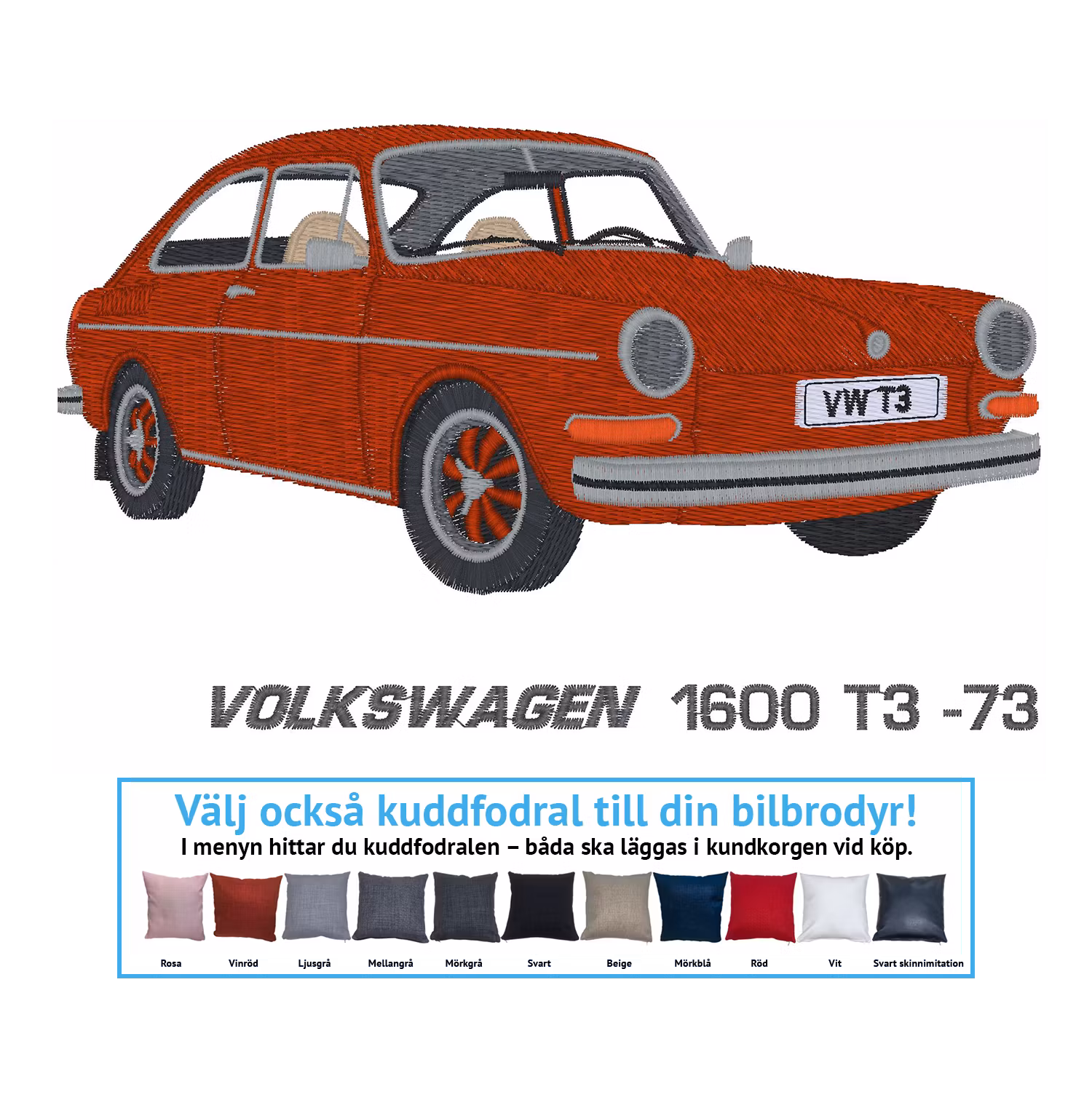 VW 1600 T3, 1973 420 kr Maskinbroderad VW 1600 T3, 1973. Välj vilket kuddfodral du vill ha brodyren på – du hittar våra kuddfodral i menyn. I lager. Lägg i korgen Artikelnummer: 375 Dela Information Maskinbroderad VW 1600 T3, 1973. Välj vilket kuddfodral du vill ha brodyren på – du hittar våra kuddfodral i menyn.