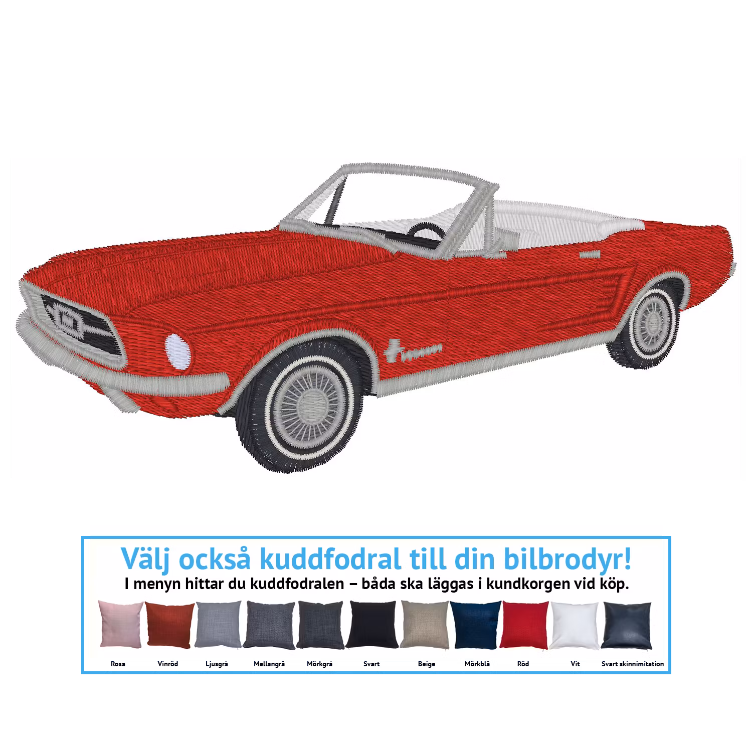 Maskinbroderad Ford Mustang convertible,1967. Välj vilket kuddfodral du vill ha brodyren på – du hittar våra kuddfodral i menyn.