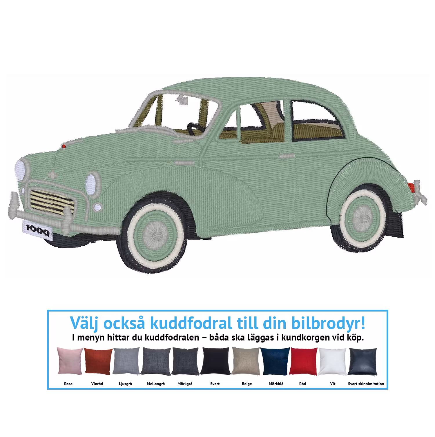 Maskinbroderad Morris Minor 1000 Saloon, 1959. Välj vilket kuddfodral du vill ha brodyren på – du hittar våra kuddfodral i menyn.