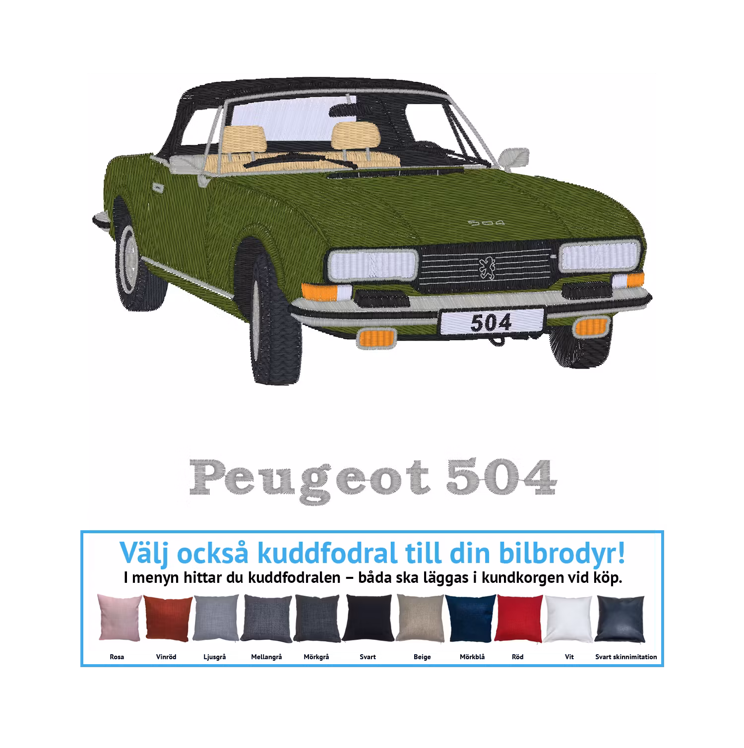Peugeot 504 cab, 1979 420 kr Maskinbroderad Peugeot 504 cab, 1979. Välj vilket kuddfodral du vill ha brodyren på – du hittar våra kuddfodral i menyn. I lager. Lägg i korgen Artikelnummer: 417 Dela Information Maskinbroderad Peugeot 504 cab, 1979. Välj vilket kuddfodral du vill ha brodyren på – du hittar våra kuddfodral i menyn.