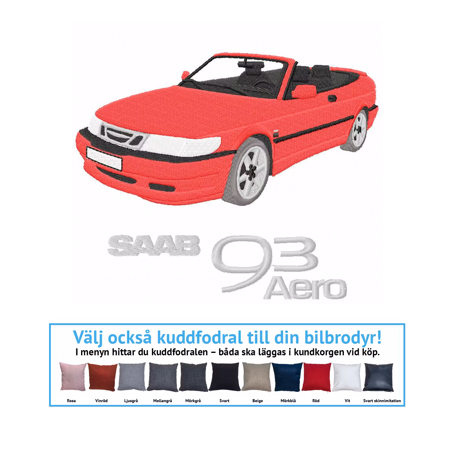 Maskinbroderad Saab 9-3 Aero cabriolet, 2003. Välj vilket kuddfodral du vill ha brodyren på – du hittar våra kuddfodral i menyn. Annan färg på karossen ingår i priset.