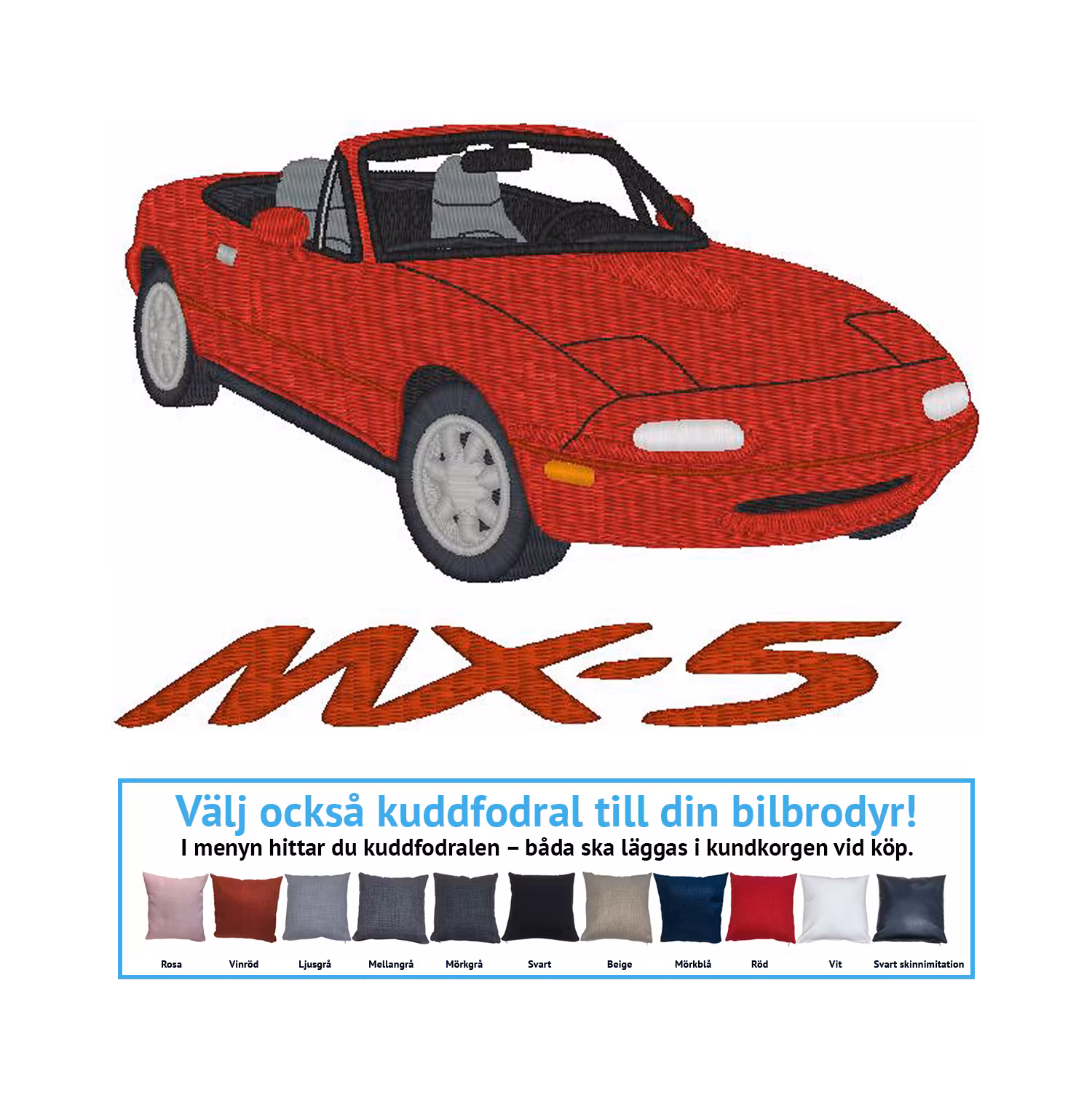 Maskinbroderad Mazda Miata MX-5. Välj vilket kuddfodral du vill ha brodyren på – du hittar våra kuddfodral i menyn. Annan färg på karossen ingår i priset.